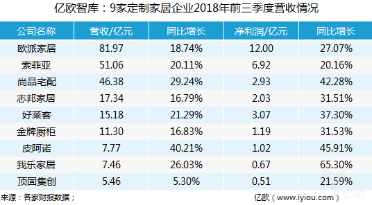 隨著消費(fèi)升級(jí),一站式購(gòu)買(mǎi)成為新的消費(fèi)觀,全屋定制成為傳統(tǒng)成品家具企業(yè)布局的新方向,原有的單品企業(yè)也開(kāi)始布局全屋定制業(yè)務(wù)。2017-2018年,定制家居企業(yè)歐派家居、尚品宅配、志邦家居、我樂(lè)家居、皮阿諾、金牌廚柜、頂固集創(chuàng)等7家企業(yè)登陸主板市場(chǎng)。從Q3季度營(yíng)收情況來(lái)看,定制家居企業(yè)凈利潤(rùn)平均增速35.85%,超過(guò)了億歐家居關(guān)注的主流家居上市企業(yè)整體增速(46家家居上市企業(yè)凈利潤(rùn)增速平均33.34%)。
